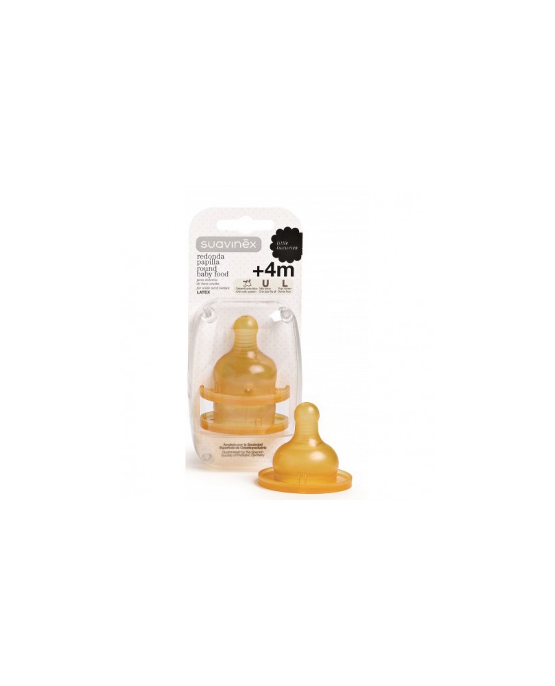 Tetina de látex boca ancha para papilla. Técnicas de esterilización aprobadas por el fabricante: - En frío, mediante su inmersión en solución esterilizante de biberones de acuerdo con sus instrucciones de uso. Recomendamos el Sistema de Esterilización en frío Suavinex. - En agua hirviendo, durante al menos 5 minutos. - En microondas, mediante vapor intenso de agua. - No se aconseja emplear técnicas de esterilización diferentes a las